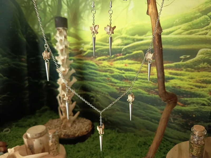 Une paire de boucles d’oreille et un collier. Les deux sont en os et en acier.